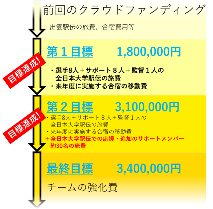 本プロジェクトは、12月3日15:00現在、3,115,000円のご支援をいただき、第二目標である3,100,000円を達成することができました。クラウドファンディング終了間際にも関わらず引き続きご支援してくださった皆様、心から感謝申し上げます。中四国駅伝では2位という結果に終わり、大変悔しい思いをしました。これを糧にチームの強化に努め、来年度も全国の舞台で戦えるよう精進してまいります。