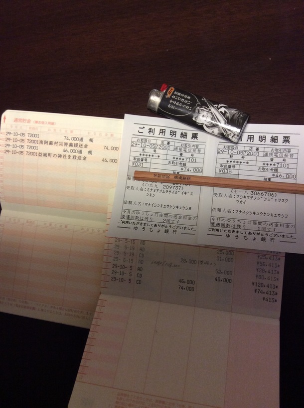 また、ご購入時に一緒に寄付をいただいたりもしまして、合計で148,000円(うち28,000円は、5月に津森神宮へお邪魔して「益城町の神社を守る会」へ直接お渡しいたしました。)を、ゆうちょ銀行より送金いたしました。