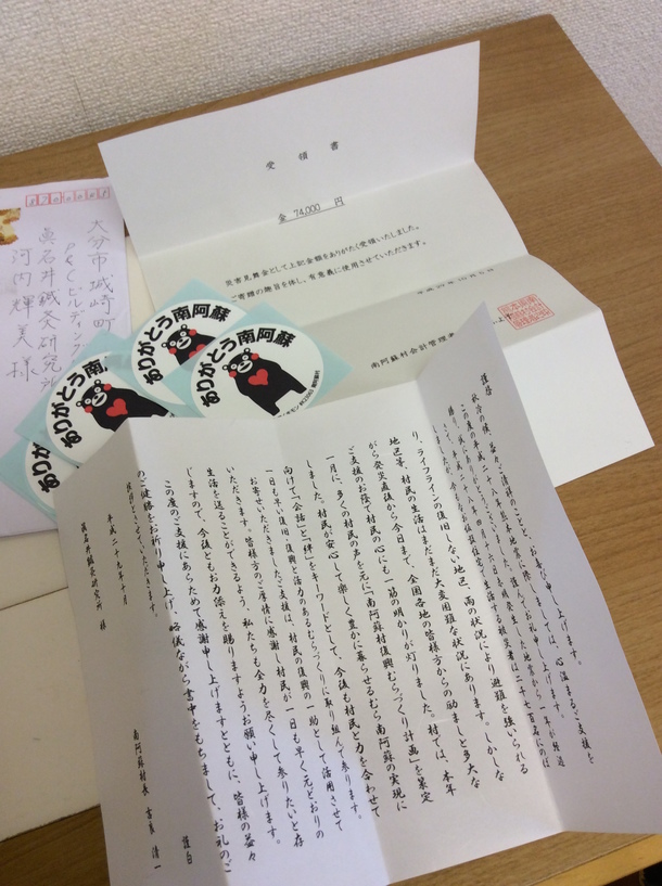 以下、南阿蘇村の村長さんより頂戴した御礼のお手紙となります。