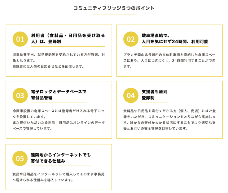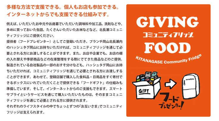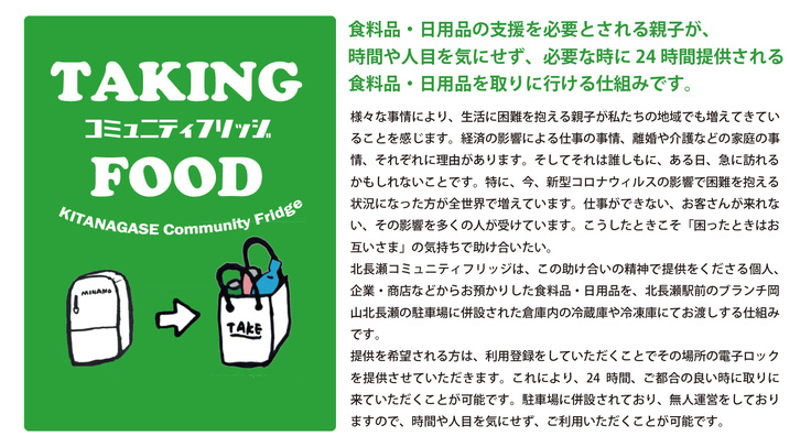 駐車場に併設されており、無人運営をしておりますので、時間や人目を気にせず、ご利用いただくことが可能です。今回のプロジェクトは、この北長瀬コミュニティフリッジを更に強化し、全国に広めていけるようサポートしていきます。