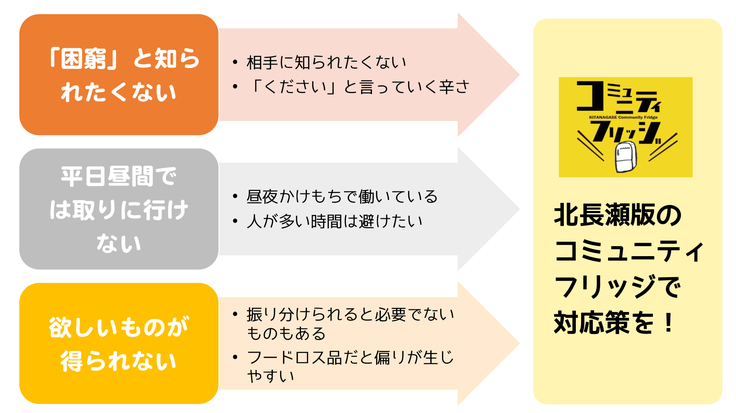 経済の影響による仕事の事情、離婚や介護などの家庭の事情、それぞれに理由があります。そしてそれは誰しもに、ある日、急に訪れるかもしれないことです。特に今、新型コロナウィルスの影響で困難を抱える状況になった方が急激に増えています。仕事ができない、お客さんが来れない、その影響を多くの人が受けています。「こうしたときこそ「困ったときはお互いさま」の気持ちで助け合いたい。」そんな気持ちを実現する仕組みとして、「コミュニティフリッジ」という仕組みができました。