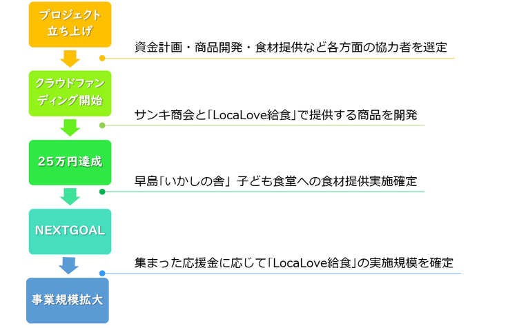皆さんの応援のお陰で、クラウドファンディングの第一目標である25万円を達成することができました!このことにより、まずは、サンキ商会との商品開発、そして、早島いかしの舎「子ども食堂」への食材無償提供が実現できる運びとなりました!