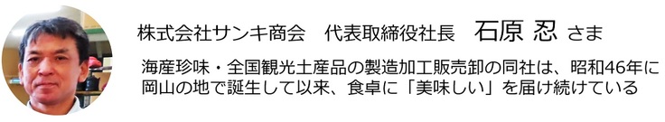 創業50年となるサンキ商会は、高い技術と行き届いた安全管理で、伝統の食品、生珍味を造り続ける岡山が誇るメーカーです。