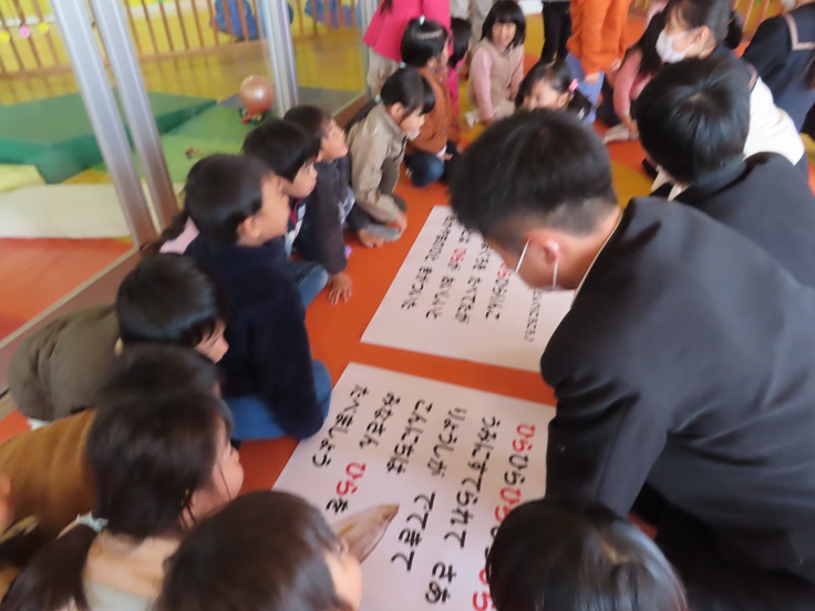 また、「どんぐりころころ♪」を、替え歌にした「ひらのうた」を創作し、子どもたちと一緒に歌って大盛り上がり!大きく引き伸ばして印刷した歌詞カードは、園長先生のご要望により、贈呈して帰りました!