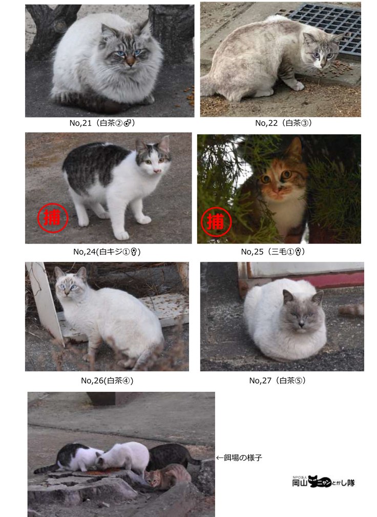 B町エリアは既に岡山市の地域指定を受けているエリアです。今回は新たに現れた猫のうち4匹参加予定です。うっかりカメラを忘れてスマホで取った写真で個体の特徴が分かりにくかったのですが、もう一度猫調査に行って写真を撮りなおしてきました。