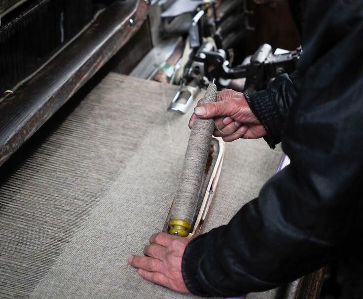 島津毛織さん織機はなんとションヘル式織機!手織りの感覚に近く、繊維への負荷を極力少なくすることができるため、手触りや肌ざわりのよい高級感のある毛織物が生産できるそうです。