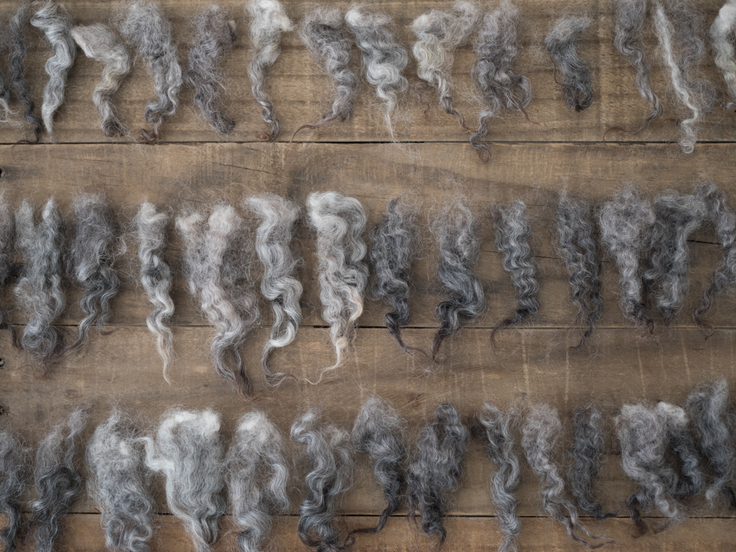 届いた羊毛を広げ、毛の状態を確認して解毛、汚れた羊毛をお湯につけて洗うと、お湯が真っ黒になります。何度も何度もすすぎと洗いを繰り返します。1頭の羊毛を洗うには、かなりの時間と手間がかかりますが、洗い上がりの輝くような羊毛を見ると苦労が吹き飛ぶ、そんな心境です。(かなりマニアック)