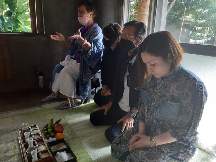 渡具知綾子は、沖縄県古宇利島で神女(シャーマン)をつとめています。琉球の母であり、沖縄最強のユタの顔も持ち、全国各地はもとよりお忍びで数多くの芸能人が相談に訪れます。一般社団法人祈りの森・風・名護曲は、渡具知綾子を代表理事として、「人類発祥の島 古宇利島からのメッセージ」として、自然崇拝・自然との共存/共栄、自然に対しての感謝の気持ちを伝える活動を展開しております。