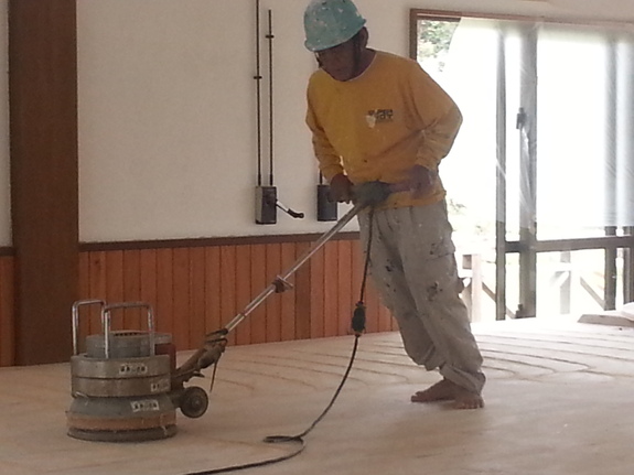 沖縄の県産材「イタジー」 イタジーの森は、まるでブロッコリーに見えるので、地元では「ブロッコリーの森」とも言われています。 その材が、森のおもちゃ美術館のフローリング材として大活躍しています。国頭村に残っていた在庫の関係で、たけが短く、しかも硬いイタジーを細かく細かく職人さんの手によって貼り付けていきました。 頭の下がる見事な仕事ぶりです。 そして、1回目は目が粗いやすり、そして写真のサンダーは2回目の目の細かいものによる作業です。 すべすべの肌触りで、入館者は、きっと、靴下を脱ぎたくなることでしょう! さて、1ヵ月を切った「一口館長」の募集。さらに約140人分を必要としています。周りの方々や遠方の知人など、更なる幅広いご紹介を、何卒宜しくお願いします。