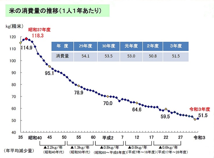 お米の消費は1960年代頃から減少傾向にあり、逆にパン類の消費率が上がっています。食生活の多様化や少子高齢化など様々な要因が挙げられ今後もさらに加速していくそうです。そのため多くの農家が厳しい経営状況に直面しています。そこで私たちは日本人の試食であるお米の消費を増やし、日本の農業を未来に繋げるために何かできないかと考えました。