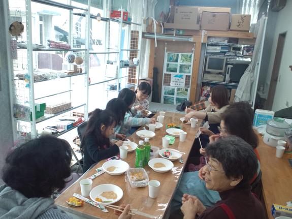 おこし型料理教室のあと、みんなで食べている様子。作ってすぐに食べられる手軽さが魅力です。