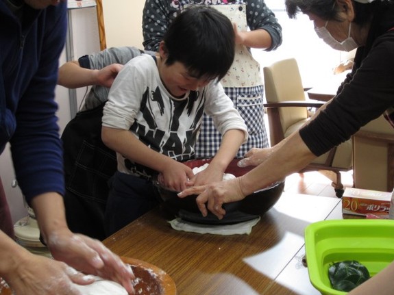 今回は、こねるところから体験してもらいました。初めての方もいらっしゃいましたが、頑張ってもらいました。だんだん力が入っていきますね。