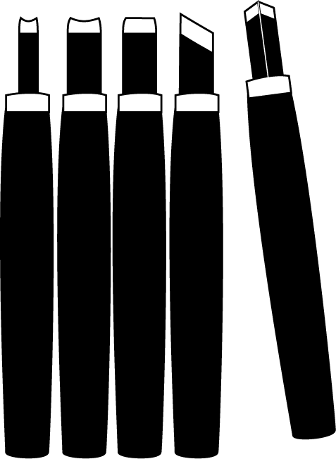 彫刻刀は、普通上記のような5本セットで販売されています。百円ショップでも販売しています。ゴムや柔らかい木で、それほど彫らないならこれでも構いません。しかしながら、おこし型は違います。長年使い続けるために、比較的固い木を使い、しかも彫りが深いという特徴があります。文具屋さんや百円ショップの彫刻刀だと、すぐに切れ味が落ちて実用に耐えないのです。事実、私もたくさんの彫刻刀を試してきましたが、1本あたり1000円以上のものでないと実用には厳しいと感じています。個人的にお勧めなのはネットでも3000円程度で売っている中級クラスのものです。やはりこのクラスは違います。あとは好みだと思います。