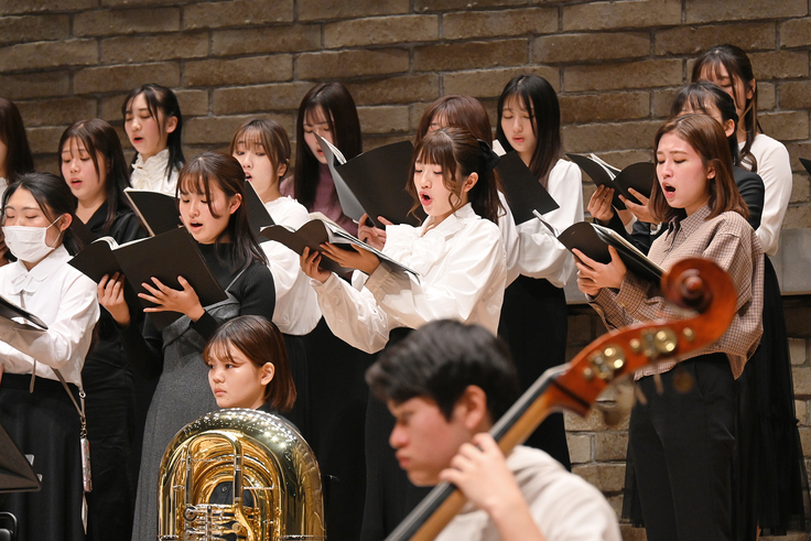 定期演奏会は授業の集大成です。合唱、教員や選抜学生によるピアノ協奏曲及び管弦楽作品を、ザ・シンフォニーホールやいずみホール等日本を代表する著名なコンサートホールで実施してきました。これまでに飯森範親氏、秋山和慶氏、本名徹次氏など世界的な指揮者を客演に、ベルリンフィルハーモニー管弦楽団のヴァイオリン奏者、シモン・ベルナルディーニ氏をソリストとして招くなど、古典から現代まで、幅広いレパートリーの作品の演奏で好評を得ています。