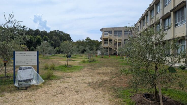 そんな中,今回のプロジェクトが始まり,今年の3月にオリーブの植樹が行われ、荒れていた学習園が「オリーブの森」に新しく生まれ変わりました!!