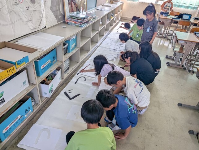 「何て書こうかな?」「もっと,こっちに書いてみよう!」大きい布に書くのは難しい!