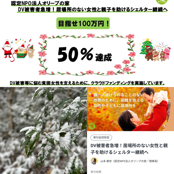 オリーブの家は、DV被害者のための保護シェルター運営維持のためにクラウドファウンディング挑戦中です(^∇^)