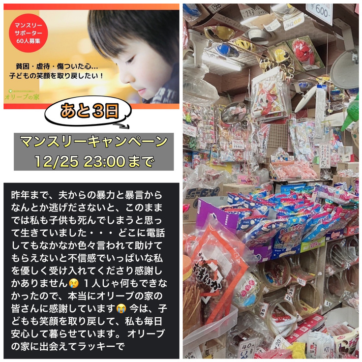 支援させていただいている母子家庭の子どもたちとシェルター内の子どもたちに大好きな駄菓子をプレゼント🎄🎄