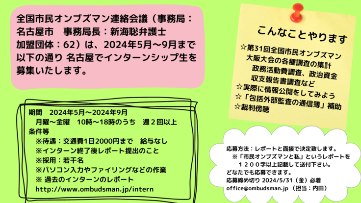 全国市民オンブズマン連絡会議(事務局:名古屋市 事務局長:新海聡弁護士 加盟団体:62)は、2024年5月~2024年9月まで以下の通り 名古屋でインターンシップ生を募集いたします。主に全国市民オンブズマン連絡会議の調査・資料集計を担当して頂く予定です。