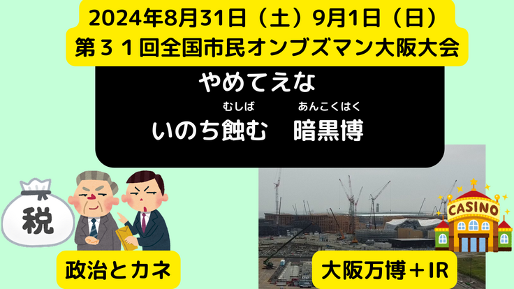 24/5/24(金)に全国市民オンブズマン連絡会議は拡大幹事会を開き、24/8/31(土)9/1(日)に開催する第31回全国市民オンブズマン大阪大会のキャッチコピーを「やめてえな いのち蝕む 暗黒博」に決定しました。