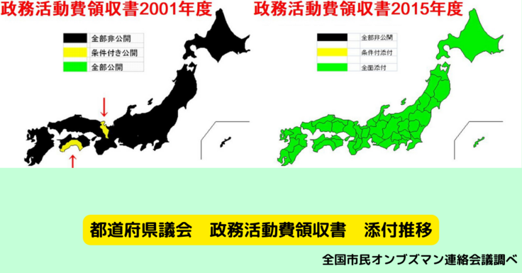 市民オンブズマンはこれまで少なくとも全国で436億円の不正を認めさせました。 1995年から市民オンブズマンが全国各地で追及した官官接待・カラ出張について、都道府県が自主調査した結果をまとめたところ、25都道府県で約436億円の不正を認めさせました。 2014年に“号泣県議”で話題となった「政務活動費」の問題も、市民オンブズマンはその15年も前から裁判や情報公開度調査などで追及し続けてきた結果、少なくとも全国で9億5000万円以上を議員から自治体に返還させています。制度が始まった2001年には領収書を一部でも公開した都道府県は2県のみでしたが、2015年にようやく全47都道府県で領収書が公開されるようになりました。