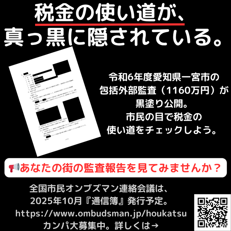 あなたの町の包括外部監査も、同じように黒塗りされていないか確認してみませんか?