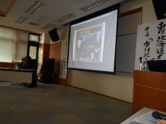 H23.24.25年度函館市包括外部監査人を務められた鎌田直善公認会計士をお招きして講演「市財政と外部委託について」をうかがう前に、「アニメでわかる包括外部監査の通信簿」を流して、包括外部監査自体の説明を行いました。