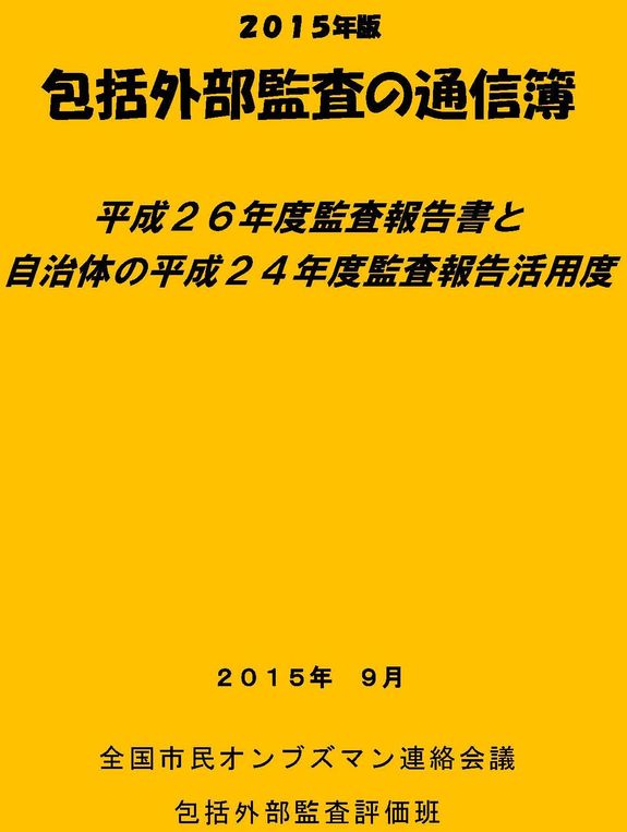 平成11年度より都道府県・政令市・中核市で義務付けられている「包括外部監査」を市民の目でチェックしようと、全国市民オンブズマン連絡会議が平成12年から毎年行っている「包括外部監査の通信簿」の2015年版が完成しましたので御連絡致します。