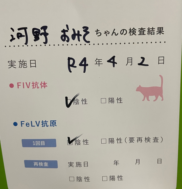 FIV(猫免疫不全ウィルス)とFeLV(猫白血病ウィルス)は陰性となっています。