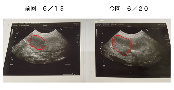 しかしながら、前回に投与が出来なかった事もあり、今回のエコー画像では、腫瘍が大きくなってしまいました。