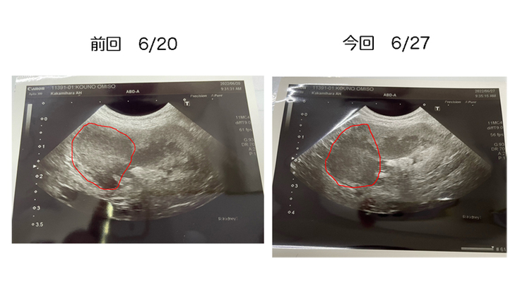 前回の少し強い点滴による治療の効果で、腎臓の外側の腫瘍の張りは治まりましたが、腫瘍自体の大きさはそれ程変化はない状態でした。