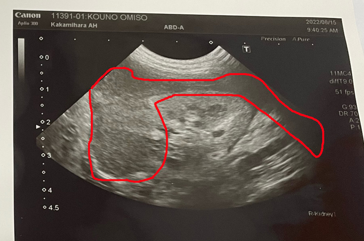 更にエコー画像では、前回腎臓の外側の黒くなっていた部分は、腫瘍が腎臓を取り巻く形になっている事が判明しました。
