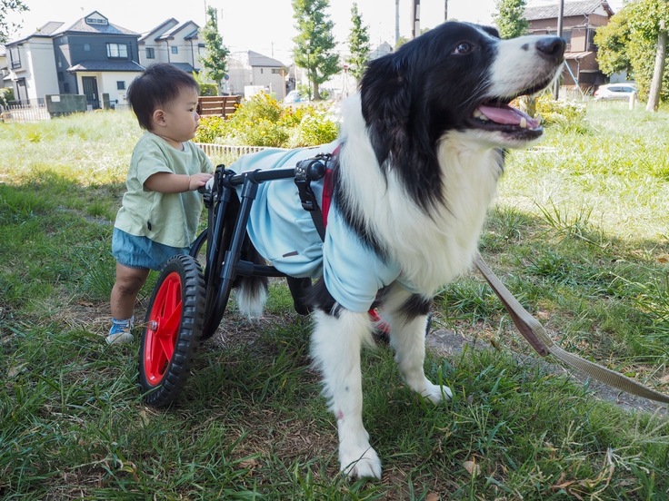 介助用ハーネスや車椅子を使って、無理をさせない程度にお散歩をしています。