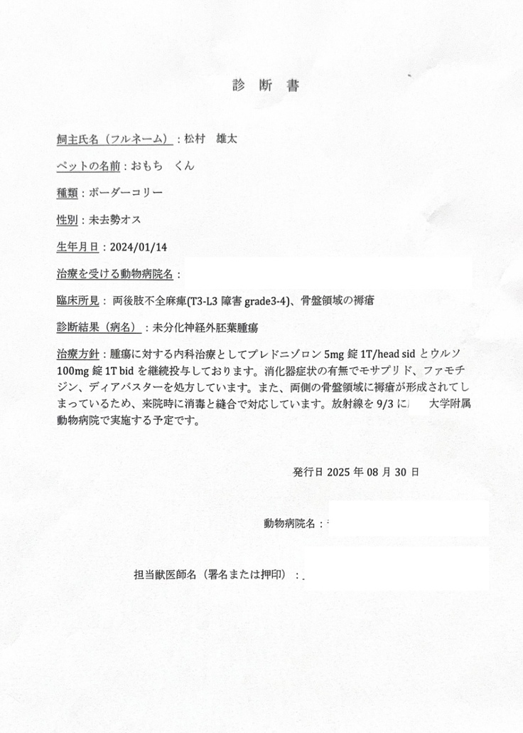 今はまだ後ろ足が麻痺し動けない状態ですが治療が進むにつれて、再び歩ける可能性があるということからひなたが歩けるようになる頃には家族みんなでおもちの大好きなお散歩に行けたらいいなと願っております。