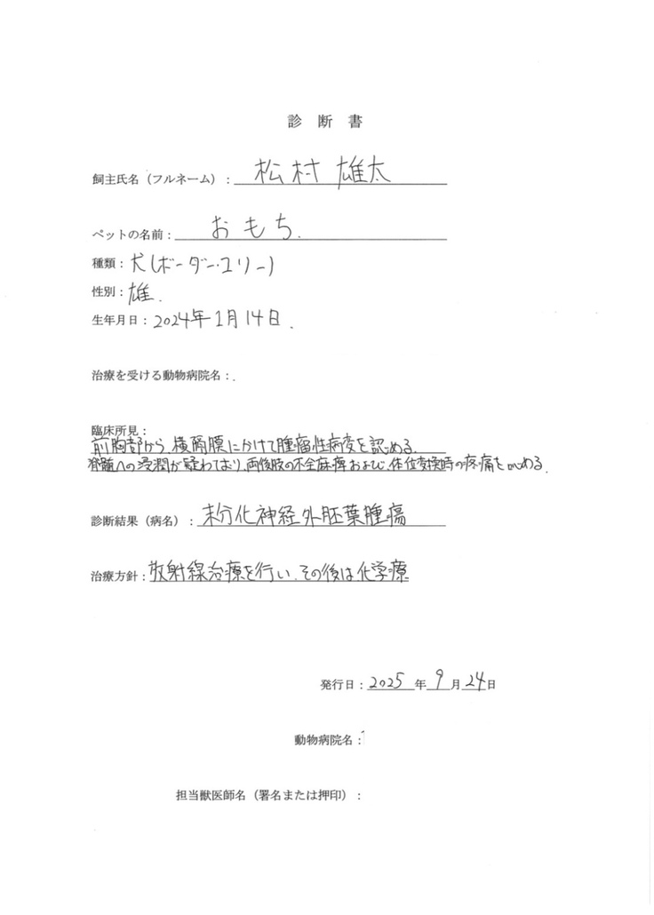 おもちの現在治療中である未分化神経外肺葉腫瘍の為の今までと今後の治療費にあてます
