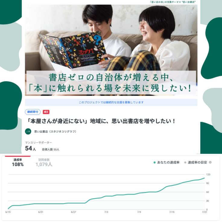 継続寄付サポーター募集が、目標の108%を達成し、54人の方がサポーターになっていただけました。 募集期間の約1ヶ月、必死になって活動してくれたスタッフ、温かい応援メッセージを送ってくださったサポーターの方々、シェアを通して広めてくださった方々、ひとつでも欠けていたら達成できなかったと思います。 そのおかげで、思い出書店は継続的活動が可能になりましたし、「身近に本がある社会」を作っていくことができます。 感謝の気持ちでいっぱいです。 ありがとうございます。 嬉しいことに、拠点オーナーになりたいと手を挙げていただける方がさっそく出てきており、少しずつ前に進んでいけそうです。 また、募集終了後も「寄付をしたい」というお問い合わせを何名かにいただきました。 常設型のサポーター募集ページをご用意しますので、寄付が間に合わなかった方はそちらをご確認いただけたらと思います。 ほっと一息入れつつ、地に足をつけてこれからも活動し続けていきます。 思い出書店 みずの