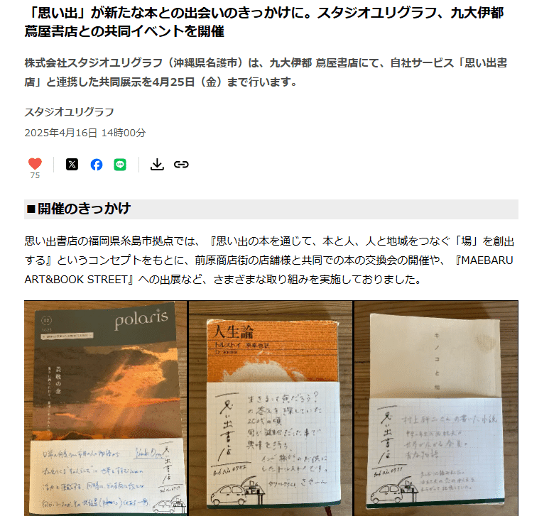 糸島拠点のお話を通して、思い出書店の広がりや人とのつながりを感じていただけたら嬉しいです。