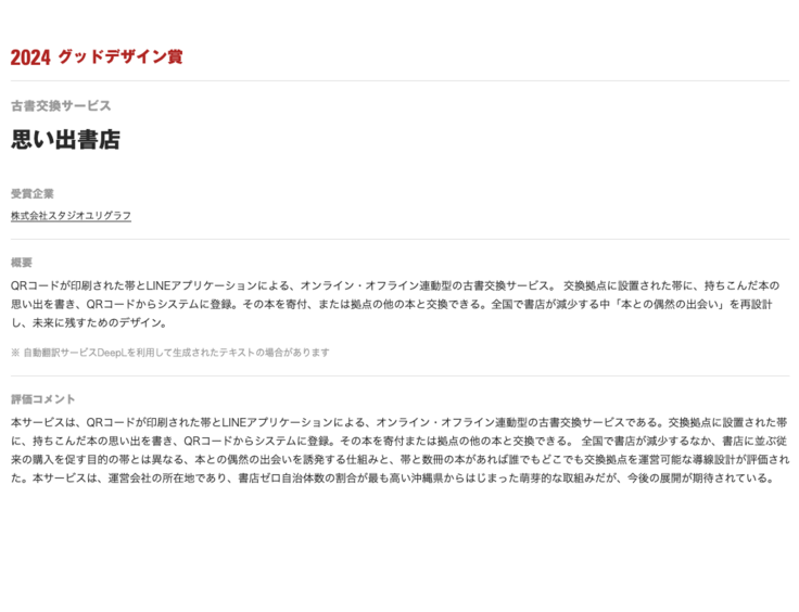 思い出書店がグッドデザイン賞を受賞いたしました。