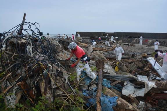 民家の資材と思われる大きな木材や鉄骨、生活感の残る日用品や洋服、折れ曲がったガードレールや標識。