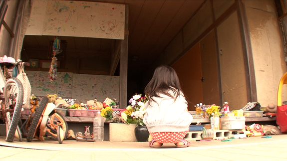 解体されずに残る、被災した上野さんの古い自宅の前で、いつものように小さな手を合わせます。お父さんやお母さんがやっているのを見ていて、自分一人でも出来るようになりました。