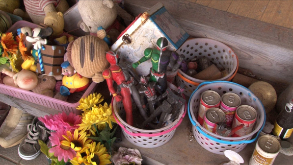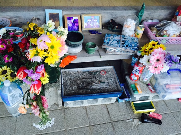 かつての玄関は、亡くなった4人のための祭壇に変わっています。