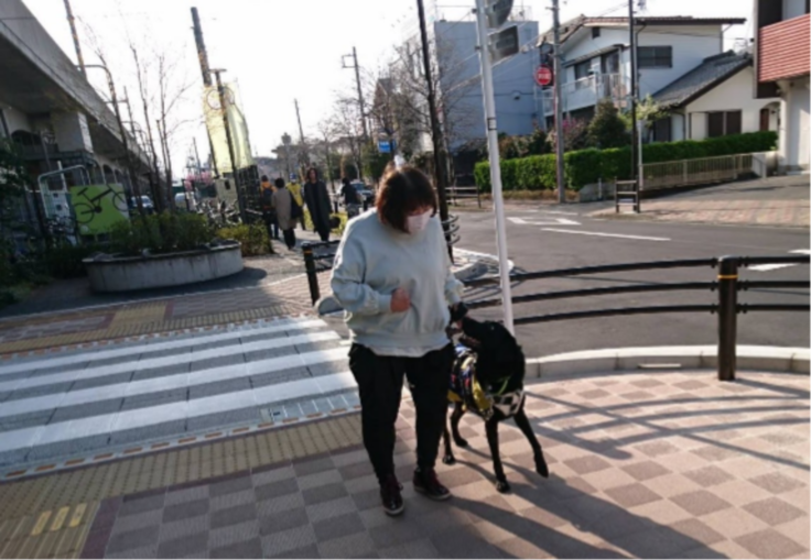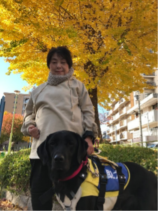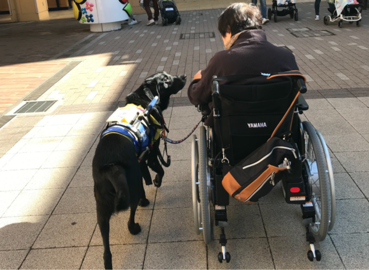 しかし一人で外に出ることは勇気がいります。まず私には心と体をほぐしてくれる何かが必要でした。そんな時出会ったのが介助犬です。一人で外出する時も何処に行くのも一緒。介助犬は私を楽しませ、喜ばせ、そして勇気を与えてくれるかもしれないと思いました。2年前、介助犬候補のスパークと出会い、認定を受け介助犬ペアになりました。スパークと一緒ならスーパーもショッピングモールも駐車場がある所なら一人で車で出かけられるようになりました。
