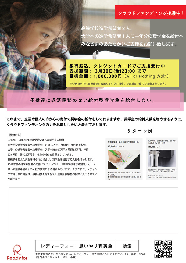 ※リターン(返礼品)は、ご支援頂いてる地元企業にご寄附頂きます。クラウドファンディングで集めた寄付金は仕入れなどには使用せず、事務経費を除く全額が奨学給付金になります。【発送は2018年5月を予定】