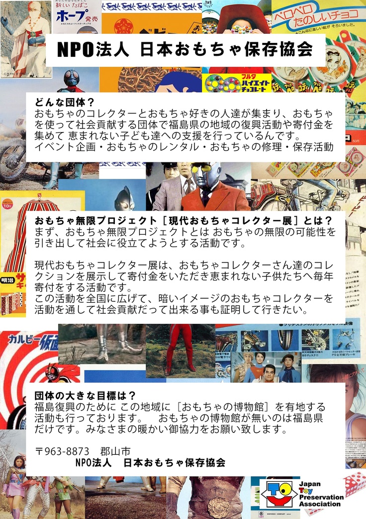 設立は平成26年11月です。 東日本大震災の3年後、震災復興の為 おもちゃのコレクター達が社会貢献を目的に立ち上がり設立した団体です。