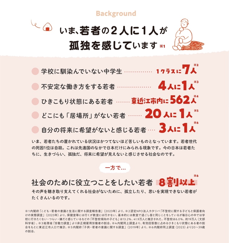 私たち「若者の居場所OMUSUBI」(あいとうふくしモール)は、滋賀県東近江市で、 ひきこもりなどの孤立状態にある若者たちが日常的に通える場づくりを行っています。
