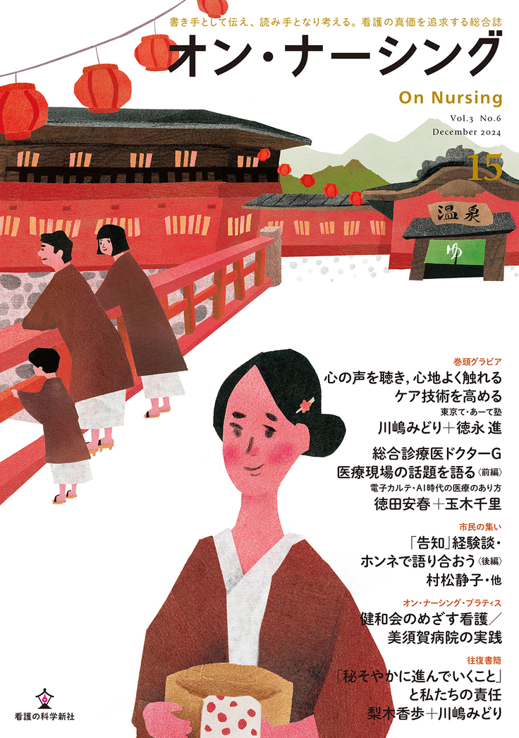 みなさまにご支援いただきました「オン・ナーシング」は第15号刊行の準備が整いました。第15号刊行を迎えることができましたこと,あらためてお礼申し上げます。ご購読いただいております方々には年末年始にお手元に届きますかと存じます。