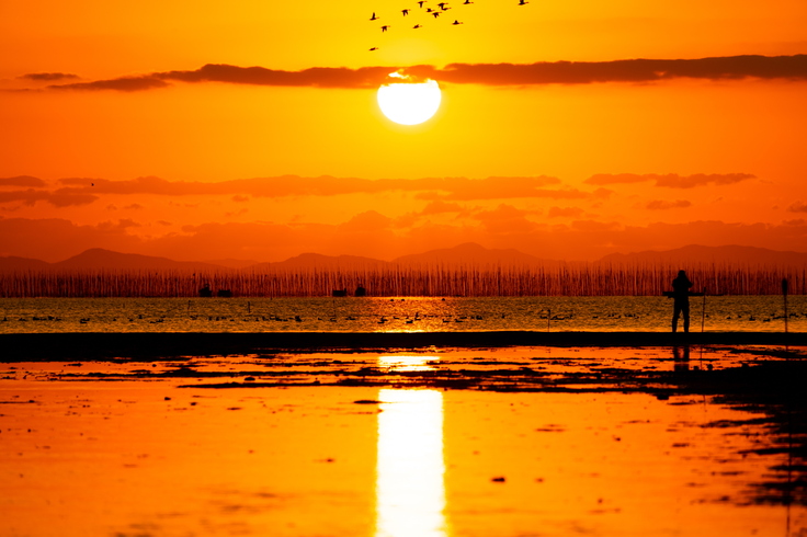 荒尾干潟は多様な生物が生息する一方で、海苔の養殖やアサリ漁などの漁業が営まれ、牡蠣の養殖も試験的に開始されるなど、豊かな漁場といった側面がございます。さらに、テーラー乗車による干潟体験やマジャク釣り大会、バードウォッチングなどのレクレーションの場としても活用され、最近では有明海に沈む夕日の風景が写真愛好家やSNSに多く取り上げられております。