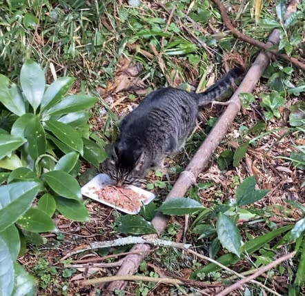 カリカリはあとで食べられるよう、そして集合時間に来なかった子用に猫ホテルの中にいれてます。