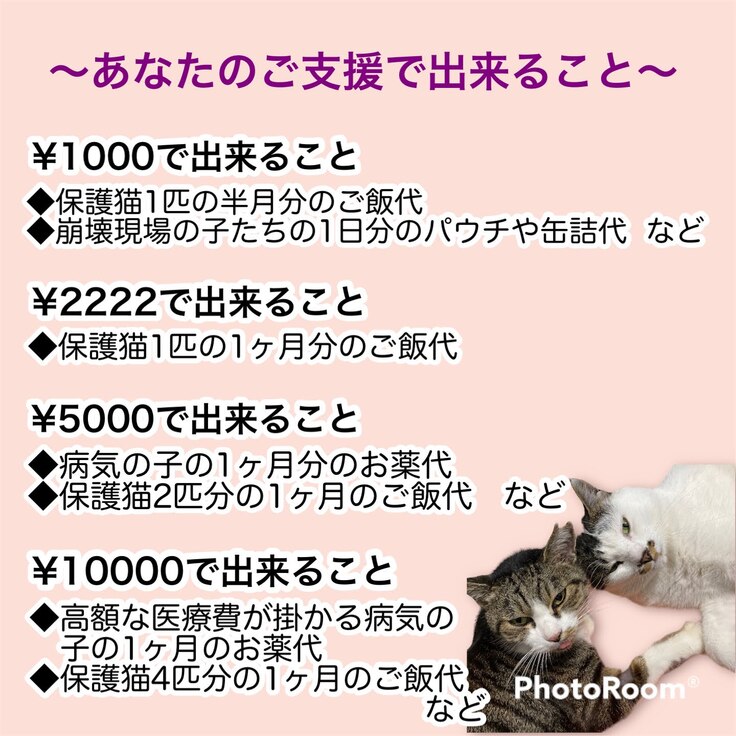 月に一回分のティータイムやランチタイム分を猫たちのための支援に充てていただけないでしょうか?
