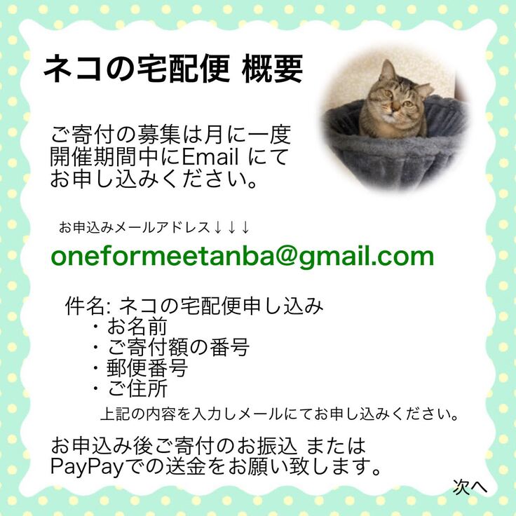 One for Mee@丹波では、毎月「ネコの宅配便」という名でご寄付を募集しております。